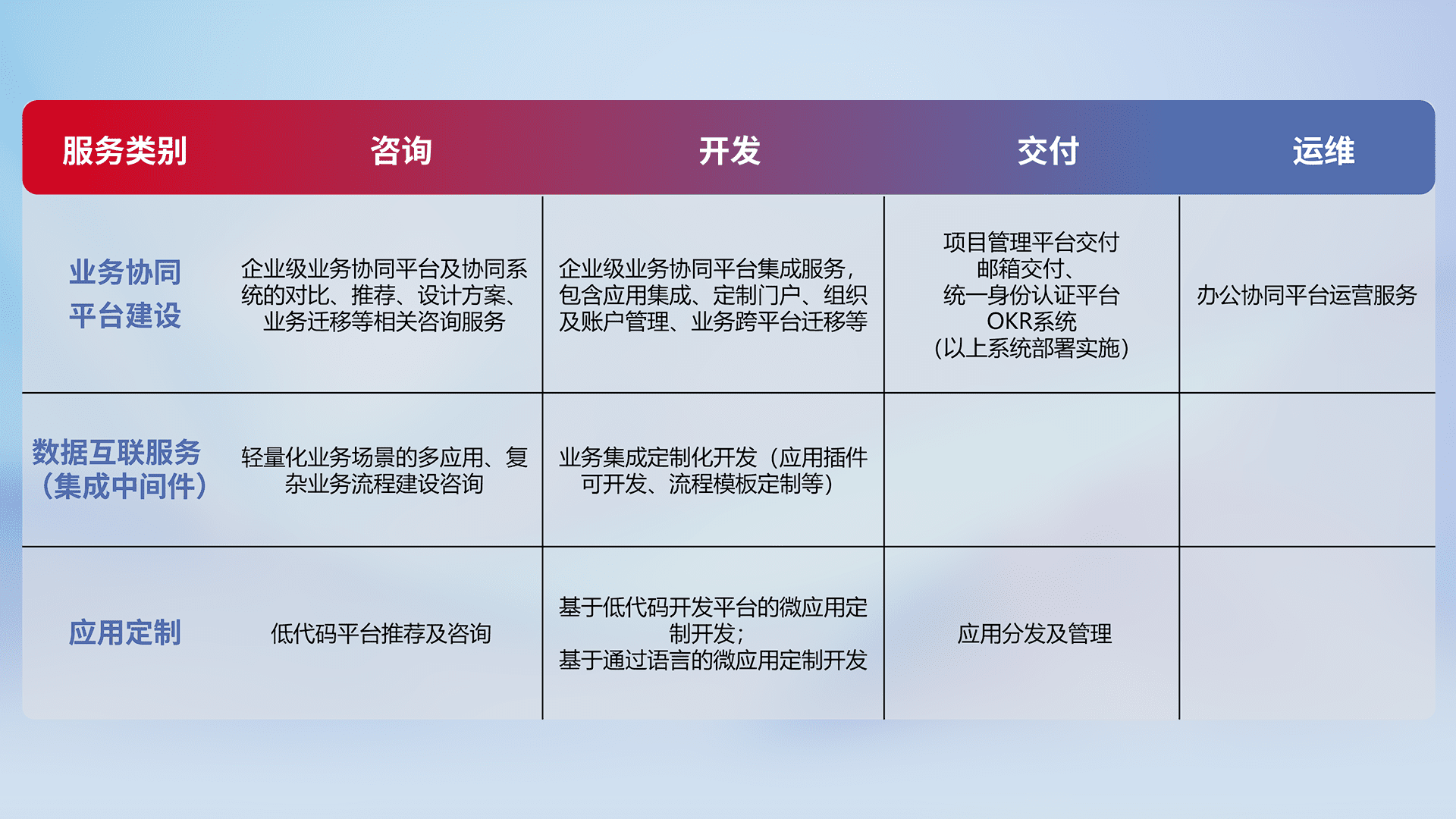针对钉钉、、、、企微、、、IDaas等平台级产品提供产品的规划、、、、方案、、、交付、、定制化开发等服务,,实现如统一协同办公、、智能客户服务、、、、混合会议管理、、智能数据查询、、、、等业务场景,,实现数字化转型。。。。
